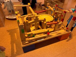 トンネルをくぐったり円盤の上を転がったりするビー玉。目をキラキラさせて、飽きることなく何回も何回も転がしていましたよ。