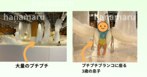 立川PLAY !PARKは期間ごとにメインの展示が変わり、2025年10月は以下の写真のように、プチプチが大量にぶら下げられていました。