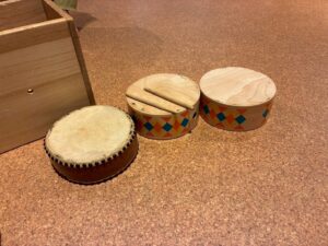 楽器コーナーには、タンバリンや太鼓、ピアノが置いてあり、自由に触ることが出来ます。